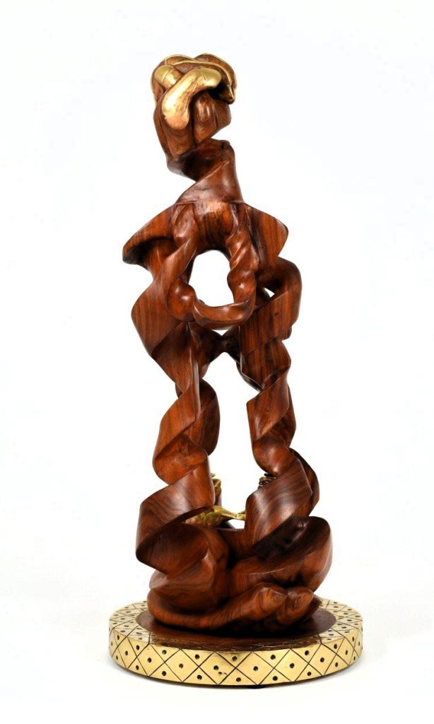 Produzida em madeira e adornada com bronze, a escultura traduz uma reflexão profunda sobre a ligação entre o efémero e o eterno, entre matéria e espírito. A composição, marcada por braços e mãos entrelaçadas, simboliza valores fundamentais como união, solidariedade, integridade e responsabilidade colectiva.